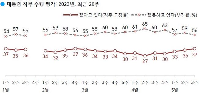 한국갤럽이 2023년 5월 셋째 주(16~18일) 전국 만 18세 이상 1,000명에게 윤석열 대통령이 현재 대통령으로서의 직무를 잘 수행하고 있다고 보는지 잘못 수행하고 있다고 보는지 물은 결과, 37%가 긍정 평가했고 56%는 부정 평가했으며 그 외는 의견을 유보했다(어느 쪽도 아님 2%, 모름/응답거절 5%).