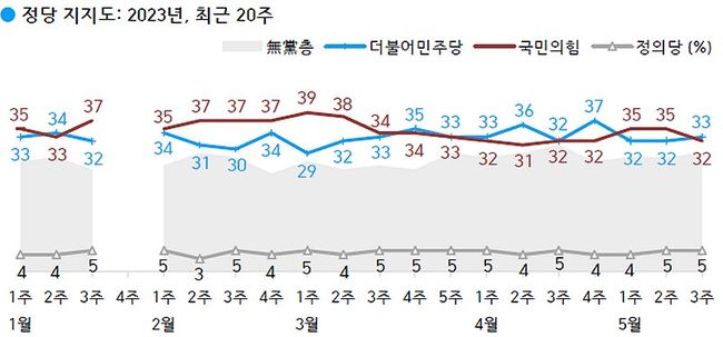 2023년 5월 셋째 주(16~18일) 현재 지지하는 정당은 더불어민주당 33%, 국민의힘 32%, 지지하는 정당 없는 무당(無黨)층 29%, 정의당 5%다. 정치적 성향별로는 보수층의 63%가 국민의힘, 진보층의 65%가 더불어민주당을 지지한다고 밝혔다. 중도층에서는 국민의힘 20%, 더불어민주당 33%, 특정 정당을 지지하지 않는 유권자가 39%다.