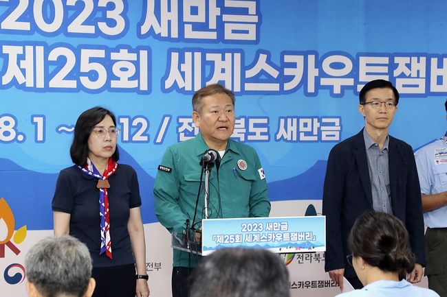이상민 행정안전부 장관이 8일 오전 전북 부안군 새만금 세계스카우트잼버리 프레스센터에서 태풍 북상에 대비한 참가 대원들의 비상대피 계획을 발표하고 있다.