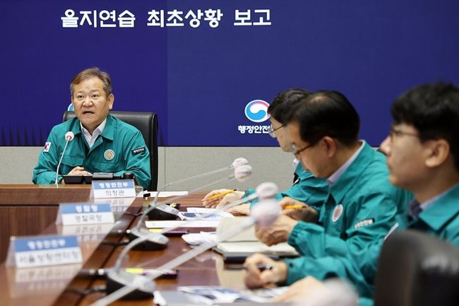 이상민 행정안전부 장관이 21일 오전 서울시 종로구 정부서울청사 서울상황센터에서 2023년 을지연습 최초상황보고회의를 주재하고 있다.