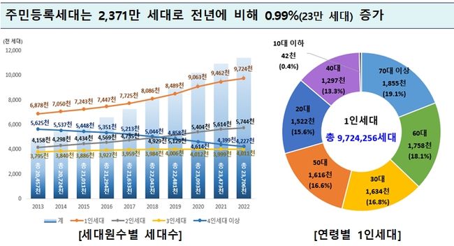주민등록세대는 2,370만 5,814세대로 전년(2,347만 2,895세대)에 비해 0.99%(23만 2,919세대) 증가했으며, 전체세대 중 1인세대가 972만 4,256세대(41.0%)로 1000만 세대 돌파를 앞두고 있어 1인 세대수의 꾸준한 상승이 전체 세대수의 지속적 증가 요인으로 크게 작용한 것으로 나타났다.