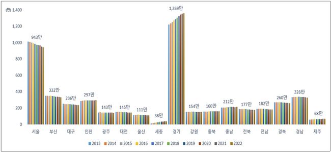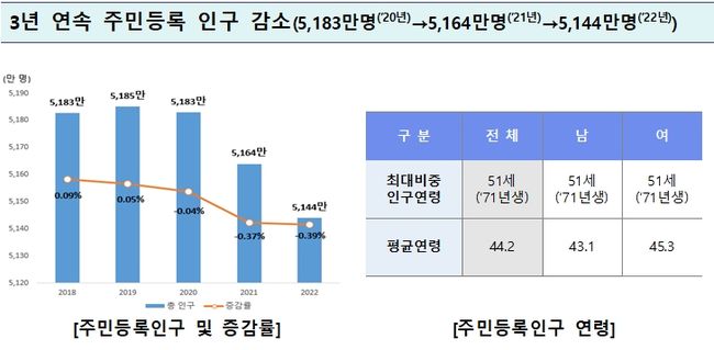 주민등록인구는 5,143만 9,038명으로 전년(5,163만 8,809명)에 비해 0.39%(19만 9,771명) 감소했으며, 3년 연속 인구 감소(5,183만명(’20년)→5,164만명(’21년)→5,144만명(’22년)) 추세를 보였다.