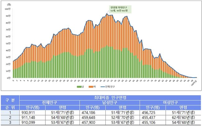 고령화 심화로 평균연령이 44.2세로 전년(43.7세)에 비해 0.5세 높아졌으며, 남녀 평균 연령은 남성 43.1세, 여성 45.3세로 여성이 2.2세 높은 것으로 나타났다. 또한 가장 인구가 많은 연령은 51세(1971년생, 93만 911명)였다.
