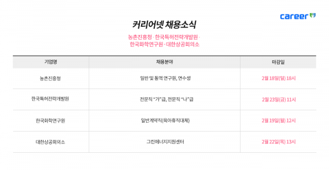 커리어넷이 농촌진흥청, 한국특허전략개발원, 한국화학연구원, 대한상공회의소 등 채용 소식을 발표했다.