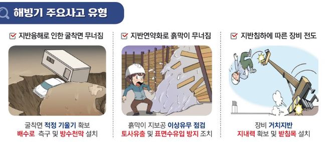 얼음이 녹기 시작하는 해빙기는 매년 2월 말부터 4월 초까지의 기간을 말한다. 날씨가 따뜻해지며 겨울철에 중단되었던 건설공사가 재개되고 새로 착공되는 현장이 많아지면서 사망사고가 발생할 위험이 높아진다.