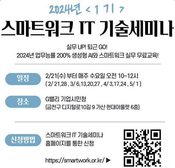 최신 정보통신(IT)기술과 인공지능(AI) 소프트웨어를 활용해 원격근무(스마트워크) 환경을 구축하고 활용하는 방법에 대해 교육한다. G밸리 기업 임직원과 실무자를 대상으로 1기부터 3기까지 운영된다. 기수 별로 매주 수요일 10시부터 12시까지 10회의 교육을 받으며 매회 50명 내외의 수강생을 모집한다. 교육과정은 ▲ 원격근무(스마트워크) 초보입문 ▲ Chat-GPT 작성 및 활용 ▲ 인공지능(AI) 도구 설명 ▲ 인공지능(AI) 이미지 생성 등이다. 교육비는 전액 무료이다.