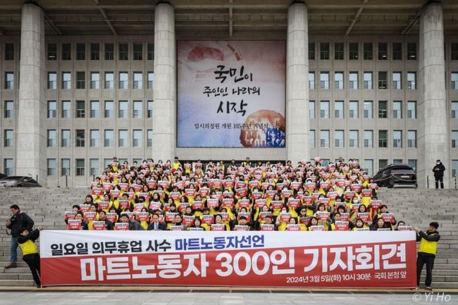 이에 마트노동자는 이해관계자의 의견 수렴 없이 추진되고 있는 대형마트 의무휴업 평일 전환을 반대하고, 유통노동자의 주말 휴식권을 빼앗는 윤석열 정부의 「유통산업발전법」 개정 추진을 규탄하기 위해 지난 2월부터 ‘일요일 의무휴업 사수 마트노동자 5만 선언운동’을 진행하는 등 주말휴식권 보장을 위한 투쟁을 진행하고 있다.