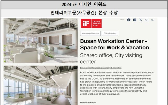 어워드를 주관하는 `iF 인터내셔널 포럼 디자인`은 “부산 워케이션 센터는 탁 트인 바다 전망과 효율적인 실내 업무공간 배치로 일의 효율성 향상은 물론 사용자들의 재충전이 가능한 공간으로 구성돼있다”라고 평가했다.