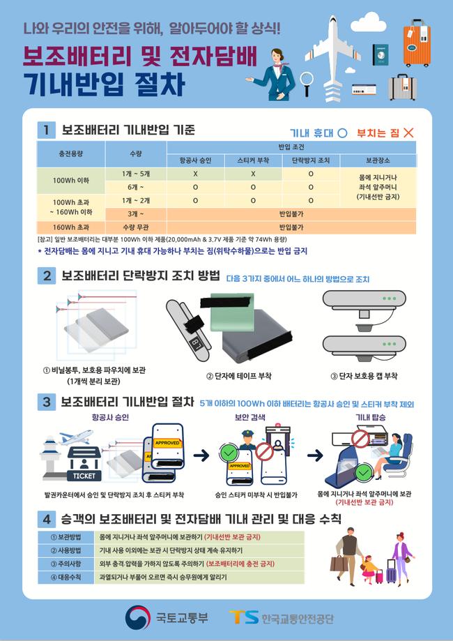 유경수 국토교통부 항공안전정책관은 “보조배터리 기내 반입에 대한 국민 불안이 큰 만큼, 이번 조치를 통해 안전 관리를 대폭 강화할 것”이라며 “승객들도 보조배터리 및 전자담배 반입 기준을 철저히 준수하고, 보안검색 및 항공사 지침에 적극 협조해 달라”고 당부했다.