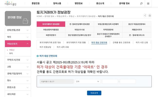토지거래허가 정보광장을 이용하려면 용산구청 누리집-`분야별 정보-부동산/토지-부동산`으로 접속하면 된다.