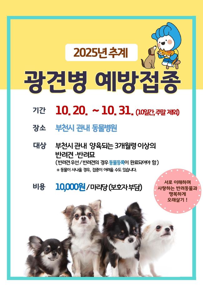 부천시가 시민과 반려동물의 건강을 위해 ‘추계 광견병 예방접종’을 실시한다.