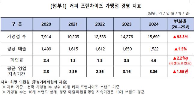 국회 정무위원회 소속 허영 의원(더불어민주당)이 공정거래위원회로부터 제출받은 ‘상위 10개 커피 프랜차이즈 현황’ 자료에 따르면, 2020년 대비 2024년 주요 브랜드 본사의 매출은 892억 원에서 2,062억 원으로 131% 증가했고, 영업이익은 102억 원에서 245억 원으로 140% 늘었다.