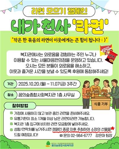 서울 강북구(구청장 이순희)는 관내 사회복지시설 꿈의숲종합사회복지관이 오는 10월 20일(월)부터 11월 7일(금)까지 3주간 라면모으기 캠페인 '내가 천사 라면'을 전개한다고 밝혔다.
