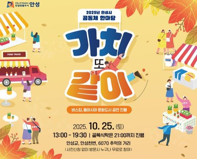 안성시(시장 김보라)는 오는 2025년 10월 25일(토), 안성시내 일원(안성교∼안성천변∼안성천∼6070 추억의거리)에서 2025 안성시 공동체 한마당 '가치 또 같이'를 개최한다.