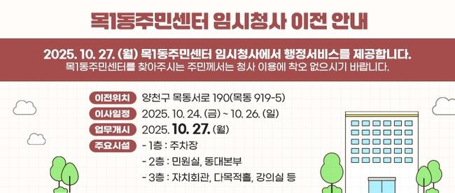 양천구, 목1동 주민센터 임시청사로 이전…10월 27일 업무 개시