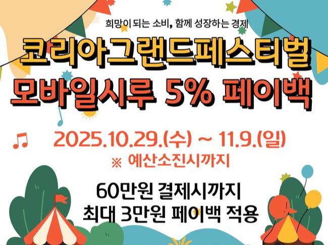 시흥시(시장 임병택)는 오는 10월 29일부터 11월 9일까지 12일간 정부가 추진하는 '코리아 그랜드 페스티벌'에 참여해 시흥화폐 '시루' 모바일결제 시 5%를 돌려주는 환급행사인 페이백을 진행한다. 이를 통해 시민들의 소비를 촉진하고 지역경제에 활력을 불어넣을 계획이다.