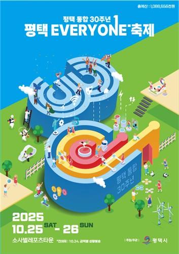 평택시(시장 정장선)는 평택시 통합 30주년을 기념해 오는 25일(토)부터 26일(일)까지 이틀간 소사벌레포츠타운 일원에서 '평택 통합 30주년, 평택 EVERYONE 축제'를 개최한다고 밝혔다.