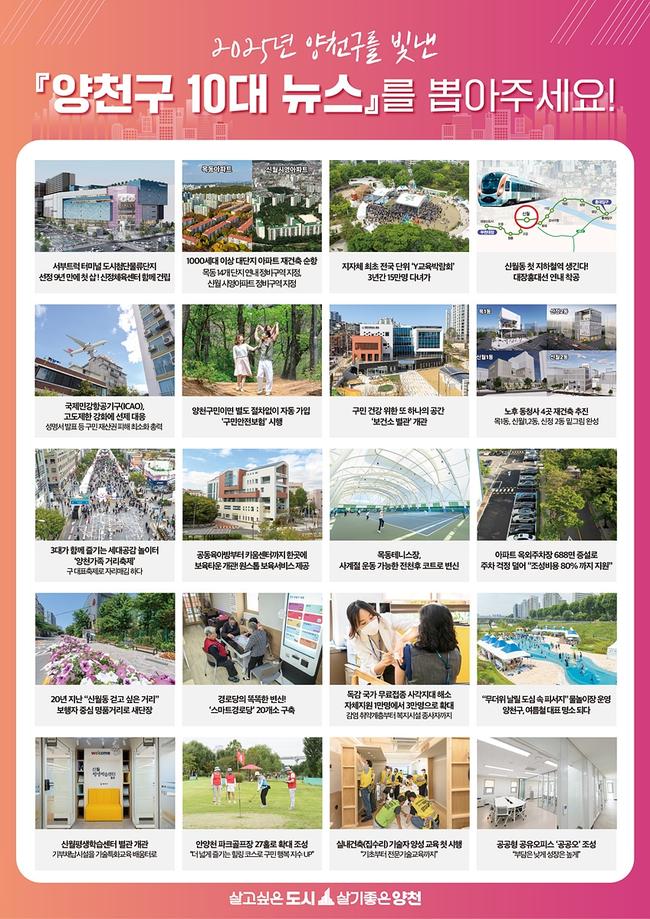 양천구(구청장 이기재)는 2025년 한 해 동안 구민의 삶에 긍정적인 변화를 이끈 주요 사업 중 구민이 가장 공감하는 뉴스를 선정하는 '2025년 양천구 10대 뉴스' 투표를 10월 27일부터 11월 14일까지 진행한다고 밝혔다.