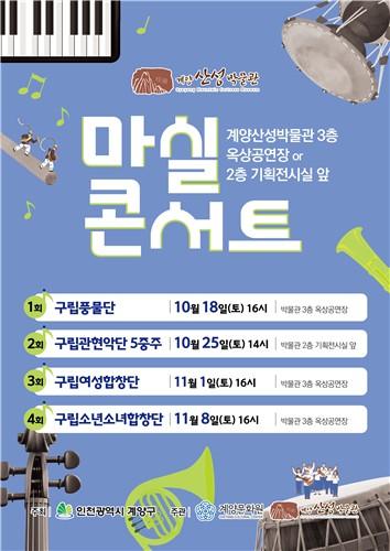 인천광역시 계양구(윤환 구청장)는 10월 18일부터 11월 8일까지 매주 토요일 계양산성박물관에서 열리는 가을 문화행사 '마실콘서트'가 깊어가는 가을 정취 속에 구민들의 큰 호응을 얻으며 진행 중이라고 밝혔다.