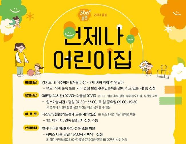 고현숙 경기도 보육정책과장은 "맞벌이 가정이나 돌봄 공백이 생긴 부모님들이 언제든 안심하고 아이를 맡길 수 있도록 '언제나 어린이집'을 지속적으로 확대하겠다"며 "앞으로도 부모의 양육 부담을 줄이고 아이들이 안전하고 행복하게 성장할 수 있는 포용적 보육환경 조성에 최선을 다하겠다"고 말했다.