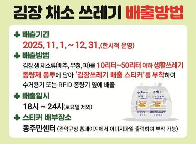 관악구(구청장 박준희)는 김장철을 맞아 대량으로 발생하는 채소류 쓰레기로 인한 주민 불편을 해소하고 쾌적한 생활환경을 조성하기 위해 11월 1일부터 12월 31일까지 '김장철 채소쓰레기 특별처리 기간'을 운영한다.