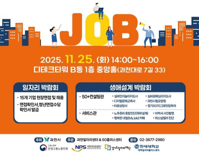과천시는 오는 25일 디테크타워(갈현동) B동 중앙홀에서 구직자와 구인기업을 연결하고 중·장년층의 생애설계 지원을 강화하기 위한 '2025 과천시 일자리&생애설계 박람회'를 개최한다고 밝혔다.