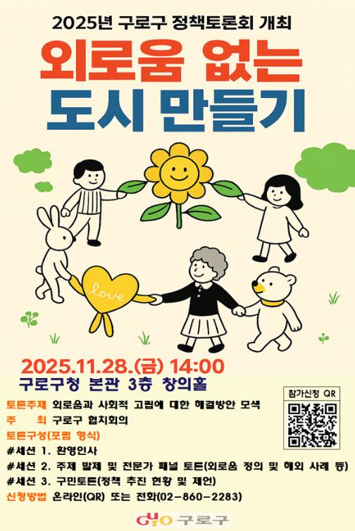 2025년 구로구 정책토론회 ‘외로움 없는 도시 만들기’ 홍보 포스터.구로구는 11월 28일 구청 본관 3층 창의홀에서 ‘외로움 없는 도시 만들기’를 주제로 정책토론회를 개최한다고 밝혔다. 이번 행사는 오후 2시부터 4시까지 진행된다.