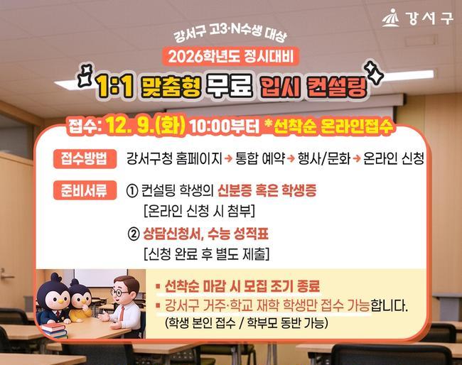 서울 강서구(구청장 진교훈)가 2026학년도 대학 정시모집을 앞두고 관내 고등학교 3학년과 재수생, 학부모를 대상으로 '1대1 맞춤형 대입 진학 컨설팅'을 운영한다.