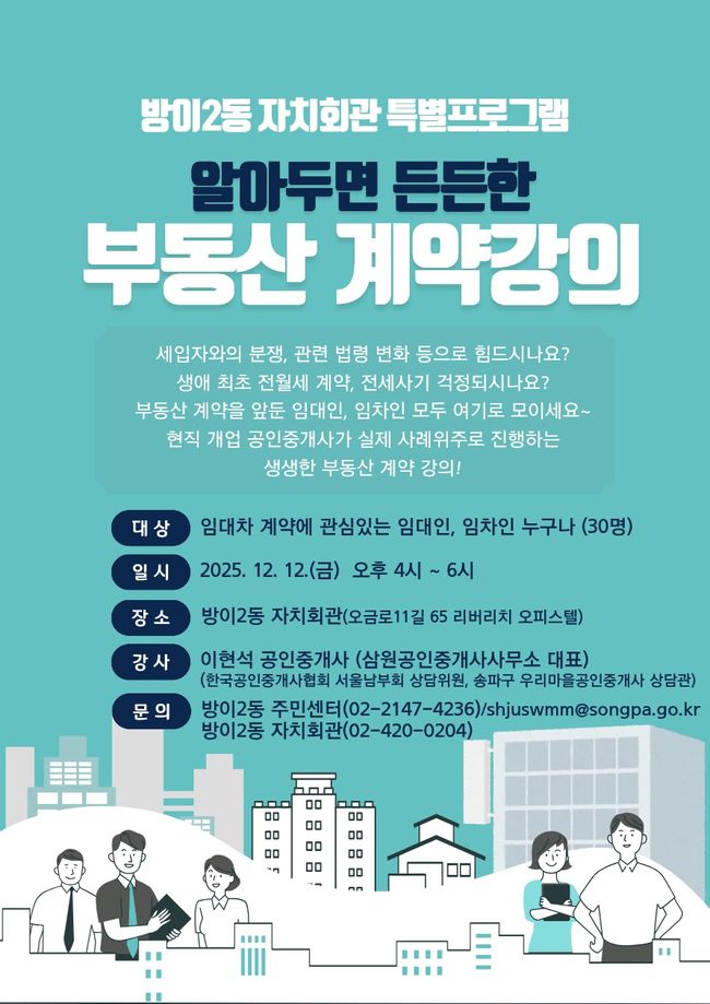 송파구 부동산 계약강의 홍보 포스터.서울 송파구(구청장 서강석)는 12일 오후 4시부터 6시까지 방이2동 자치회관에서 ‘알아두면 든든한 부동산 임대차 계약 강의’를 개최한다고 밝혔다.