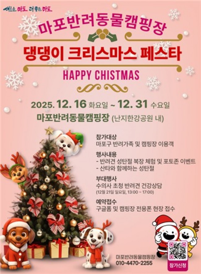 "메리 크리스마스" 마포구가 준비한 댕댕이 크리스마스 페스타마포구(구청장 박강수)는 연말을 맞아 2025년 12월 16일부터 12월 31일까지 난지한강공원 내 마포반려동물캠핑장에서 반려동물과 특별한 연말 추억을 만들 수 있는 '댕댕이 크리스마스 페스타'를 개최한다.