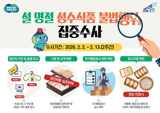 경기도 특별사법경찰단은 설 명절을 앞두고 2월 2일부터 13일까지 도내 식품제조·가공업소와 중·대형마트를 대상으로 성수식품 불법 유통 행위에 대한 집중 수사에 나선다.
