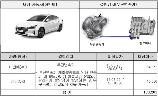 현대자동차는 아반떼 등 2개 차종 13만283대에서 무단변속기 부품 내부로 이물질이 유입돼 구동력이 전달되지 않을 가능성이 확인돼 1월 19일부터 시정조치를 진행한다. 기아는 K3 11만3,793대에서 동일한 무단변속기 결함이 발견돼 1월 15일부터 리콜에 들어간다.