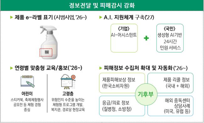 사용 단계에서는 오용 피해 예방을 위해 e-라벨 도입을 추진한다. 필수 정보는 크게 표기하고, 세부 정보는 QR코드로 제공해 접근성을 높인다. 청각·시각 장애인을 위한 수어·점자·음성 정보 제공도 병행한다. 영유아·청년층·고령층 등 연령별 맞춤형 체험 교육을 운영하고, 피해 정보 수집과 분석을 자동화해 조기 대응 체계를 구축한다. 중대한 피해가 뒤늦게 드러나는 특성을 고려해 관련 범죄의 공소시효 연장도 추진한다.