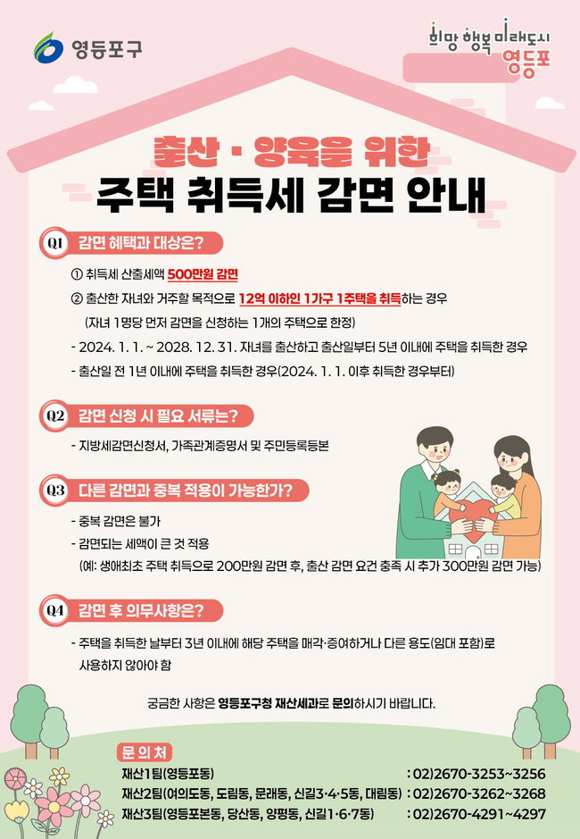 영등포구가 출산 가구에 대한 주택 취득세 감면 적용 기간을 2028년까지 연장한다.