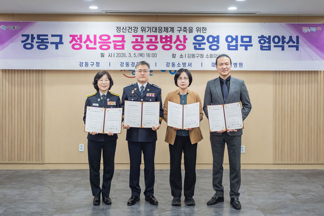 강동구 정신응급 공공병상 운영 업무 협약식.서울 강동구는 지난 5일 구청에서 강동경찰서, 강동소방서, 마인드웰병원과 ‘정신응급 공공병상 운영’을 위한 업무협약을 체결하고 오는 15일부터 본격 운영한다고 밝혔다.
