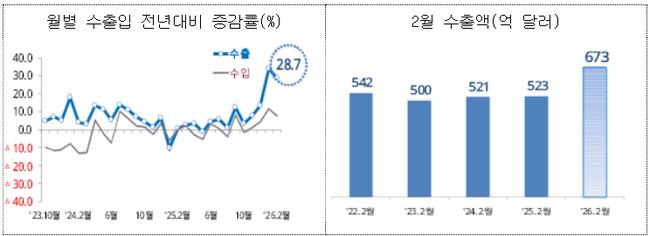 관세청이 발표한 ‘2026년 2월 월간 수출입 현황(확정치)’에 따르면 지난 2월 수출은 전년 동월 대비 28.7% 증가한 673억 달러, 수입은 7.5% 증가한 519억 달러로 집계됐다. 이에 따라 무역수지는 154억 달러 흑자를 기록하며 13개월 연속 흑자 흐름을 이어갔다.