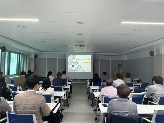 지난해 전자입찰 실무교육에서 관내 기업 실무자들이 교육을 듣고 있다.구로구(구청장 장인홍)는 오는 4월 3일 구청 본관 3층 창의홀에서 '2026년 상반기 맞춤형 전자입찰 서비스 실무교육'을 실시한다고 밝혔다.