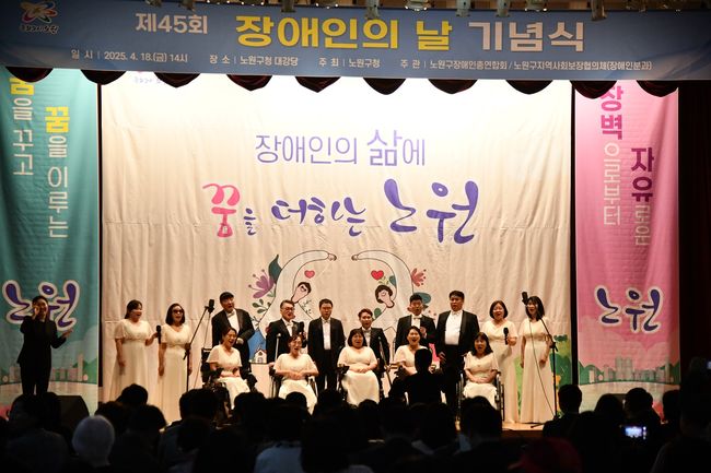 25년 장애인의 날 기념식 진행의 모습.7일 노원구(구청장 오승록)는 올해 장애인의 날 슬로건을 '벽을 허물고 마음을 채우는 노원'으로 정하고, 장애 구분 없이 모두가 어울리는 행사를 준비했다. 기념 행사는 기념식 및 복지박람회, 배리어프리 걷기대회, 진성 행복 & 웃음 콘서트 등 3개 축으로 구성된다.