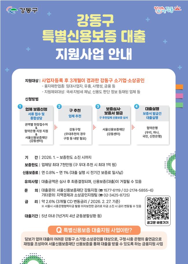 현재 현장 접수는 마감됐으나, 서울신용보증재단 강동종합지원센터 또는 국민·신한·우리·하나 등 4개 협력 은행 관내 영업점을 통해 보증 한도 소진 시까지 신청할 수 있다.