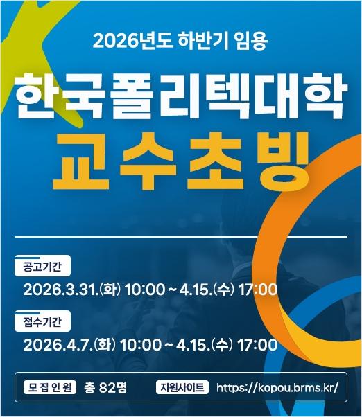한국폴리텍대학은 4월 7일부터 15일까지 2026년도 하반기 교수 공개 초빙을 통해 반도체 등 18개 분야에서 총 82명의 교원을 선발한다고 밝혔다.