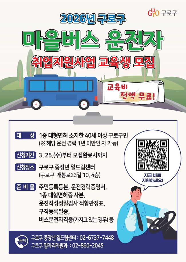 구로구 마을버스 운전자 취업지원사업 교육생 모집 포스터.구로구(구청장 장인홍)는 '2026년 마을버스 운전자 취업지원사업' 참여자를 모집한다고 8일 밝혔다. 지난 3월 25일부터 선착순 접수가 진행 중이며, 총 26명을 선발한다.