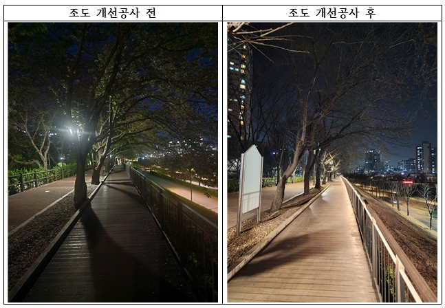 도림천 제방길 조도 개선공사 전·후 사진.구로구(구청장 장인홍)는 도림교에서 도림천역까지 이어지는 제방길 구간을 대상으로 '도림천 제방길 조도 개선공사'를 마쳤다고 8일 밝혔다.
