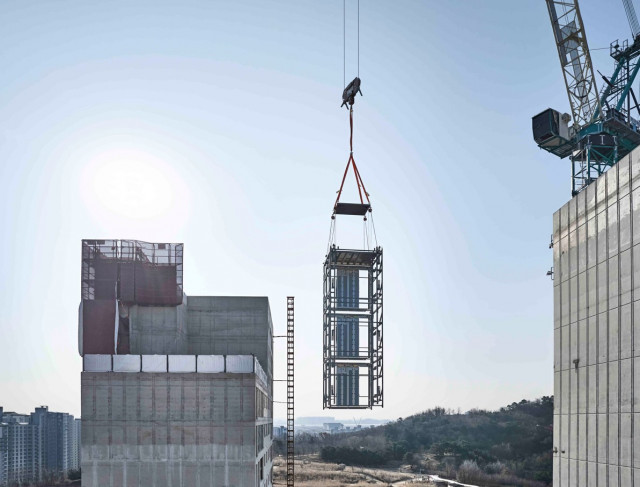 3개 층으로 사전 제작된 이노블록 모듈이 지난달 인천 송도 힐스테이트 센터파크 현장에서 적층되고 있다