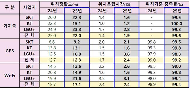 측정 결과 이동통신 3사 평균 기준 ‘기지국’ 방식 위치정확도는 25.0m에서 22.0m로 개선됐으며, ‘위성항법시스템(GPS)’은 12.7m에서 12.3m, ‘근거리 무선망(Wi-Fi)’은 18.7m에서 17.1m로 각각 향상됐다. 위치기준 충족률 역시 대부분 99% 이상으로 높은 수준을 유지했다.