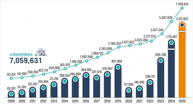 외국인 환자 유치는 코로나19로 2020년 12만 명까지 급감했으나 이후 빠르게 회복됐다. 2023년 61만 명, 2024년 117만 명, 2025년 201만 명으로 3년 연속 약 두 배씩 증가하며 매년 최고치를 경신했다. 누적 외국인 환자 수도 706만 명에 달했다.