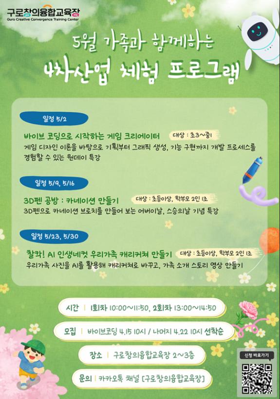 '바이브코딩 게임 크리에이터'는 생성형 AI를 활용해 게임 캐릭터와 배경을 직접 설계하고 구현해 보는 수업이다. '3D펜 공방 카네이션 만들기'에서는 3D펜으로 카네이션을 제작하며 입체 표현과 창작 과정을 경험한다. '찰칵! AI 인생네컷'은 가족사진을 바탕으로 캐리커처를 만들고 간단한 스토리 영상까지 제작해 보는 체험 과정으로 꾸려진다.