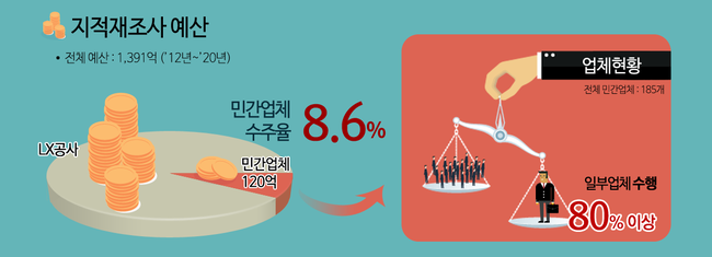 지금까지의 지적재조사는 사업시행자가 지적재조사측량 대행업무를 발주하게 되면, 한국국토정보공사(이하 LX공사)와 민간 지적측량등록업체(이하 민간업체)가 경쟁을 통해 업무를 수주하는 체계로 이뤄졌다.